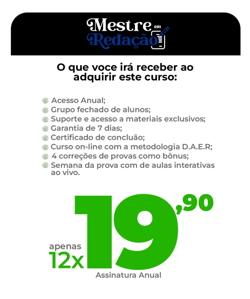 O curso “Mestre em Redação” é um programa completo desenvolvido para ajudar estudantes a alcançarem notas altas na redação do ENEM e em outros vestibulares. O curso combina técnicas de escrita, prática guiada e análise detalhada de redações para garantir o máximo desempenho.